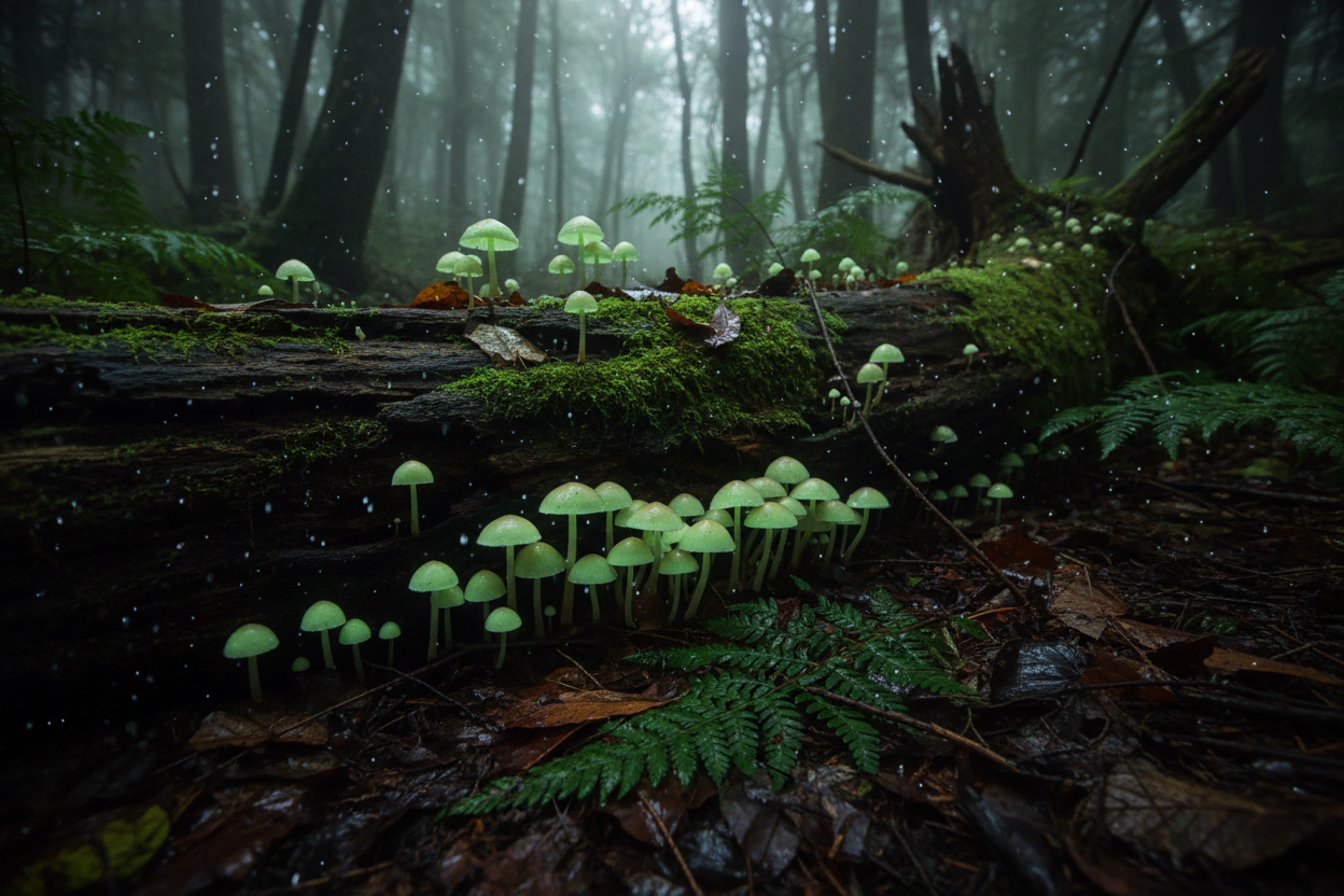 Japonya’ya özgü olan ve “göksel ışık mantarı” olarak bilinen bu tür, özellikle yağmurlu mevsimlerde çürüyen ağaç kütükleri üzerinde büyür. Büyüme sürecinde sürekli olarak soluk yeşil bir ışık yayar. Onlarca mantarın bir araya gelerek oluşturduğu görüntü, karanlık ormanda adeta ruhani bir atmosfer yaratır. Bu ışığın, sporlarını yaymaya yardımcı olacak böcekleri çekmek için evrimleştiği düşünülmektedir. Bu mantarlar, doğanın en beklenmedik köşelerde bile nasıl harikalar yaratabileceğinin canlı bir kanıtıdır.