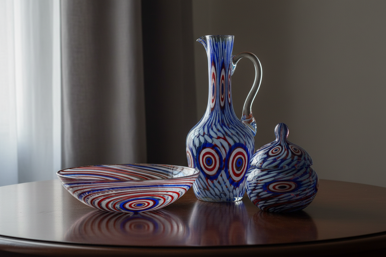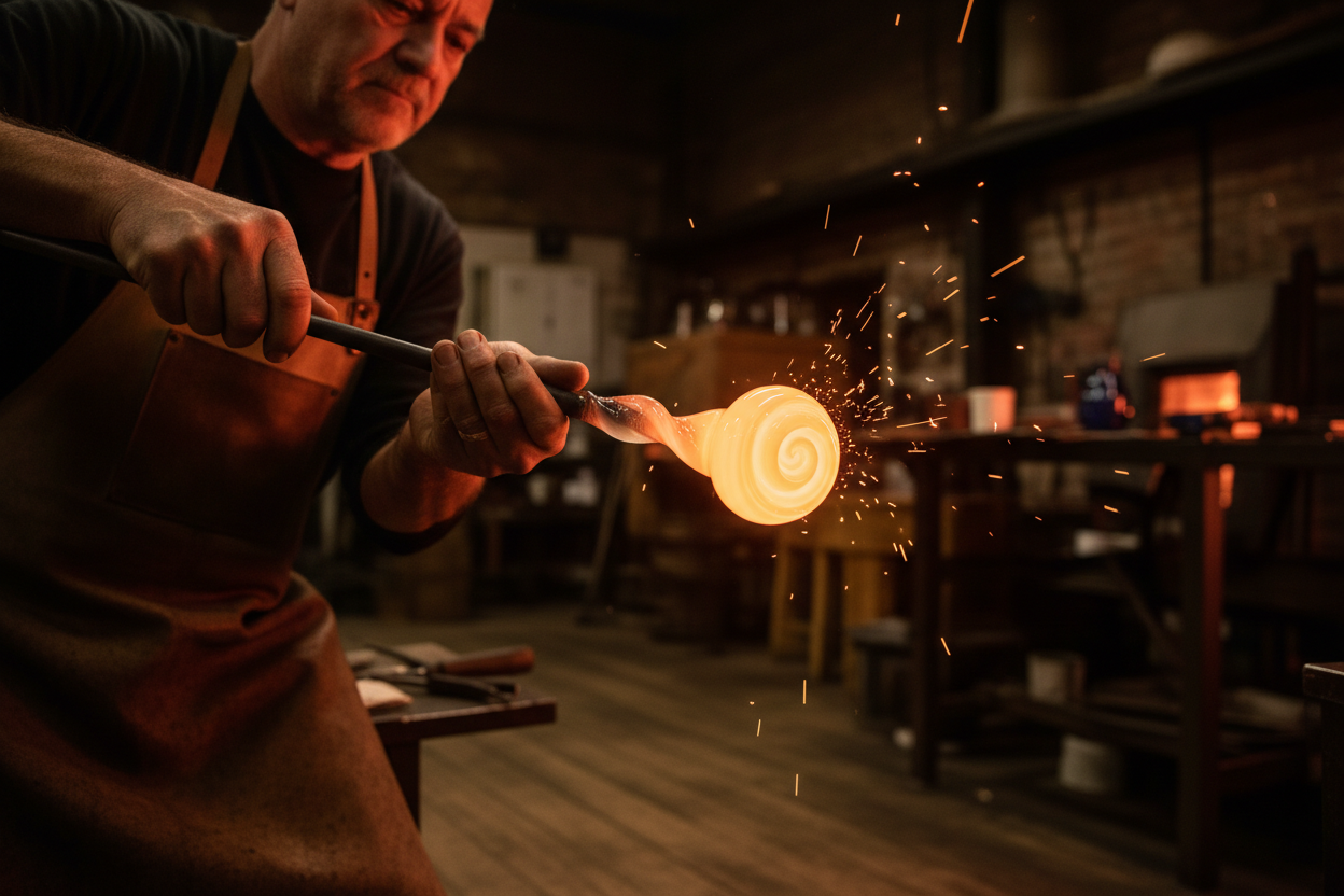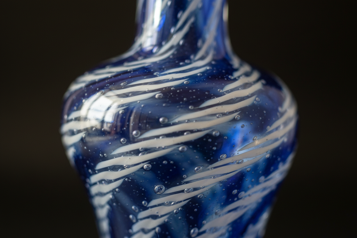 - Katmanlama ve Burulma: Renkli çubuklarla kaplanan cam balonu, tekrar fırına sokularak üzerine bir kat daha şeffaf cam sarılır. Böylece renkli çubuklar iki cam katmanı arasında kalır. Bu aşama, tekniğin en kritik noktasıdır. Usta, özel maşalar kullanarak sıcak cam kütlesini hem çeker hem de kendi ekseninde döndürerek o meşhur spiral deseni oluşturur.