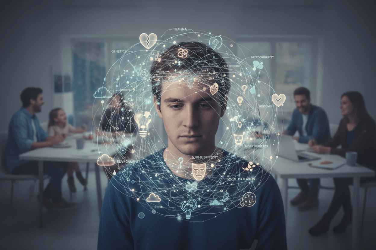 Psikiyatrik rahatsızlıkların genellikle tek bir nedeni olmamakla birlikte, distimi de psikolojik, sosyal ve biyolojik etkenlerin karmaşık bir etkileşimiyle ortaya çıkabilir. Bu durum, bireyin genetik yatkınlıkları, yaşam deneyimleri ve çevresel faktörlerin bir bütünü olarak değerlendirilmelidir.