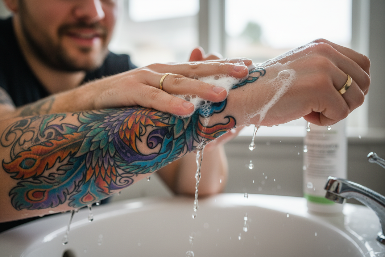 - Parfüm ve alkol içermeyen, kokusuz bir antibakteriyel sıvı sabunu avucunuzda köpürterek dövmenin üzerindeki kan ve mürekkep kalıntılarını nazikçe temizleyin.