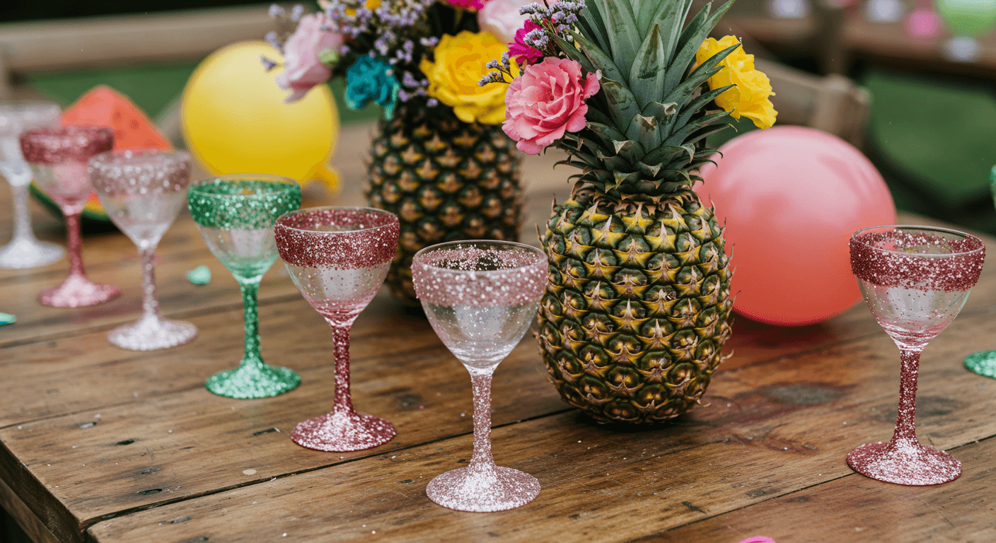 - Işıltılı Parti Bardakları: Karton veya cam bardakların alt kısmına sprey yapıştırıcı sıkarak simlere batırın. Böylece içecekler de partinin ışıltısına ortak olur.