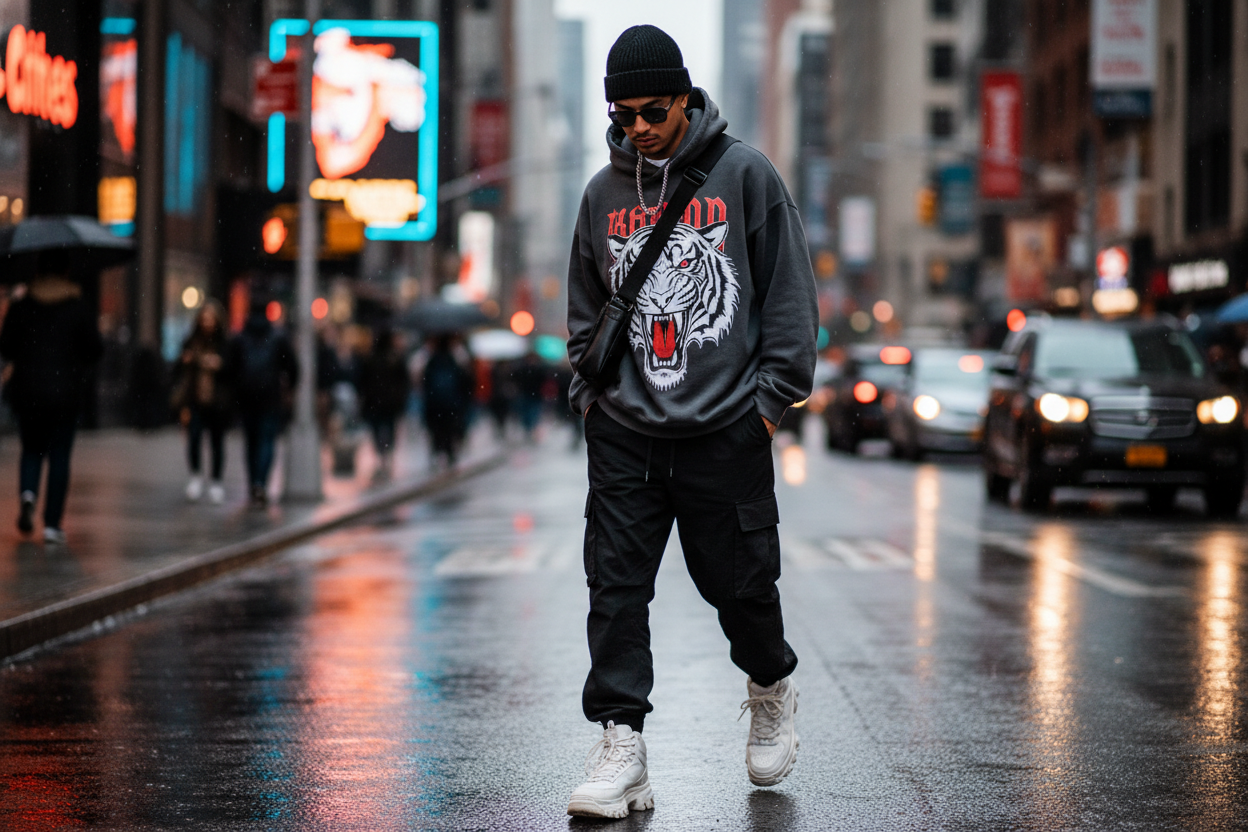 Grafik baskılı bir sweatshirt, kapüşonlu veya bol bir tişört ile kombininizi tamamlayabilirsiniz. Ayakkabı olarak ise chunky (kalın tabanlı) sneaker’lar veya bilekli spor ayakkabılar bu tarzın ruhunu en iyi yansıtan seçeneklerdir. Görünümünüzü bir bere, bel çantası veya zincir kolye gibi aksesuarlarla zenginleştirerek sokak stilinizi bir adım öteye taşıyabilirsiniz.