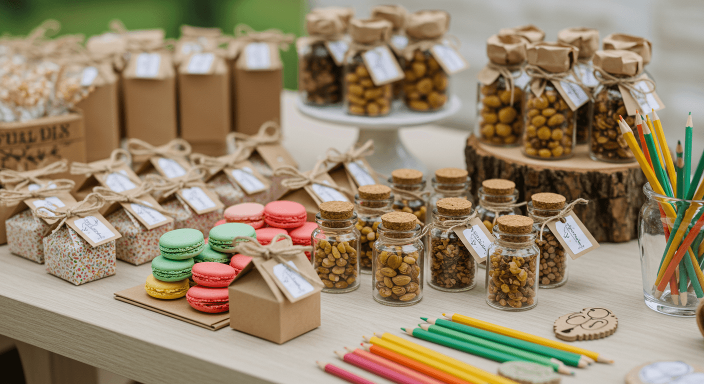 - Malzemeler: Boş cam veya pleksi mini kavanozlar, karışık çerezler (kuruyemiş, kuru meyve, mini kurabiye), renkli kağıtlar veya etiketler, makas, ince bant veya ip.