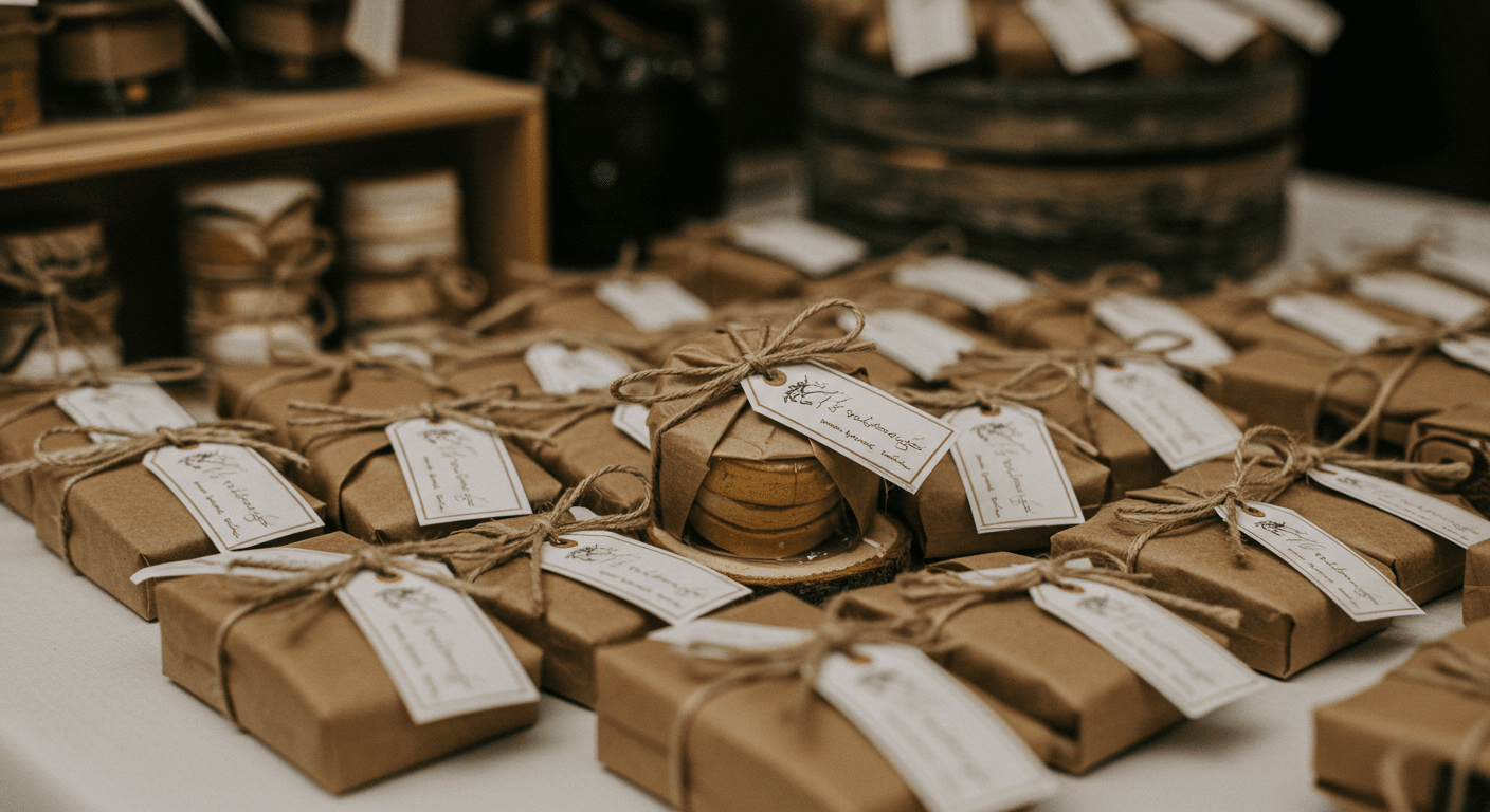 Paketleme, hediyenin ilk izlenimini oluşturur. Tül, jüt, organze gibi farklı kumaşlar veya kraft kağıt gibi doğal malzemeler kullanabilirsiniz. Kurdeleler, renk ve doku katmanın en kolay yollarından biridir. Düğün renklerinize uygun saten, dantel veya hasır kurdeleler tercih edebilirsiniz. Küçük inciler, kuru çiçekler veya şık bir mühür mumuyla da süslemeler yapabilirsiniz.