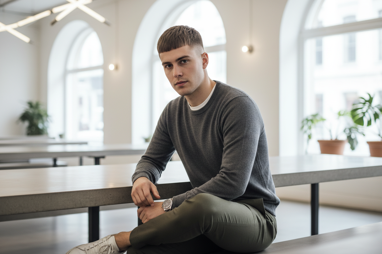 Bu modelde yanlar ve arka kısımlar oldukça kısa, genellikle makine ile 1-3 numara arasında kesilir. Üst kısım ise yaklaşık 2-4 cm uzunluğunda bırakılır ve öne doğru düz bir şekilde taranır. Net, temiz ve profesyonel bir görünüm arayanlar için mükemmel bir seçenektir.