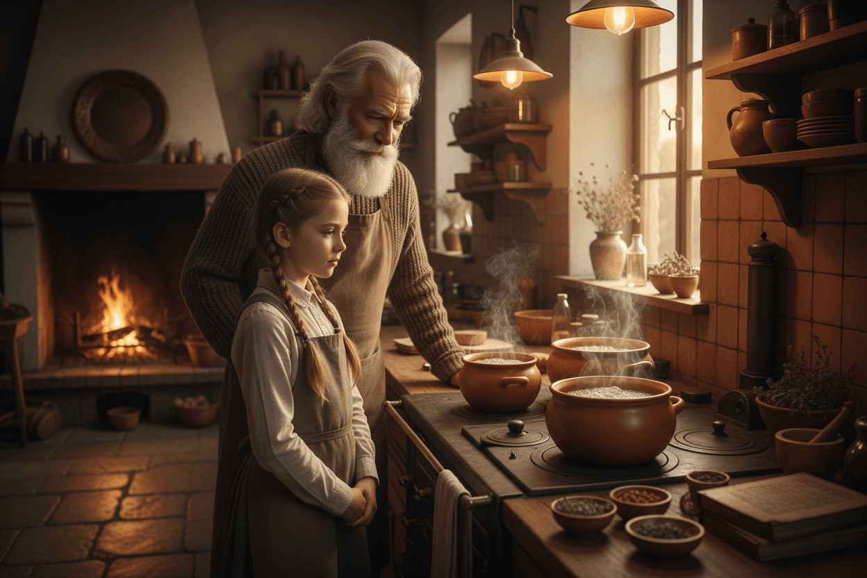 Hiç konuşmadan yirmi dakika boyunca kapların kaynamasını bekler. Süre dolunca ocağı kapatır ve kızına döner: “Ne görüyorsun?” diye sorar. Kızı biraz sabırsızca, “Havuç, yumurta ve kahve,” diye yanıtlar. Babası gülümseyerek onu daha yakından bakmaya davet eder. Asıl mesele gördükleri değil, her birinin aynı zorlu koşul olan kaynar suya nasıl farklı tepkiler verdiğidir.