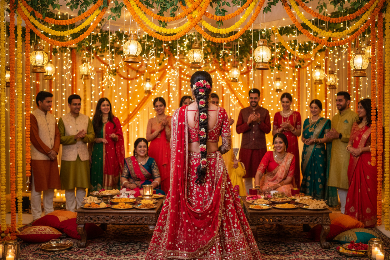 Seçtiğiniz Hint gelinliğini mükemmel bir şekilde tamamlayacak aksesuarlar ve makyaj, bütünsel bir görünüm için hayati rol oynar. Büyük ve gösterişli Chandbali küpeler, rengarenk bilezik setleri (bangles), alnı süsleyen bir maang tikka veya zarif bir baş aksesuarı ile stilinizi zenginleştirebilirsiniz. Makyajda ise genellikle gözleri ön plana çıkaran dumanlı göz makyajı ve canlı renkte rujlar tercih edilir. Bu detaylar, Hint temalı kına gecenizde tam anlamıyla bir yıldız gibi parlamanızı sağlayacaktır.