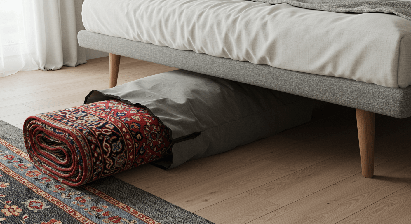 Kullanım için halıyı temizleyin, rulo yapın ve hurca yerleştirin. Fermuarı kapatmak, tam koruma sağlar. Evde basit bir hurç için eski örtüleri değerlendirebilirsiniz, ancak profesyonel modeller daha etkili olur.