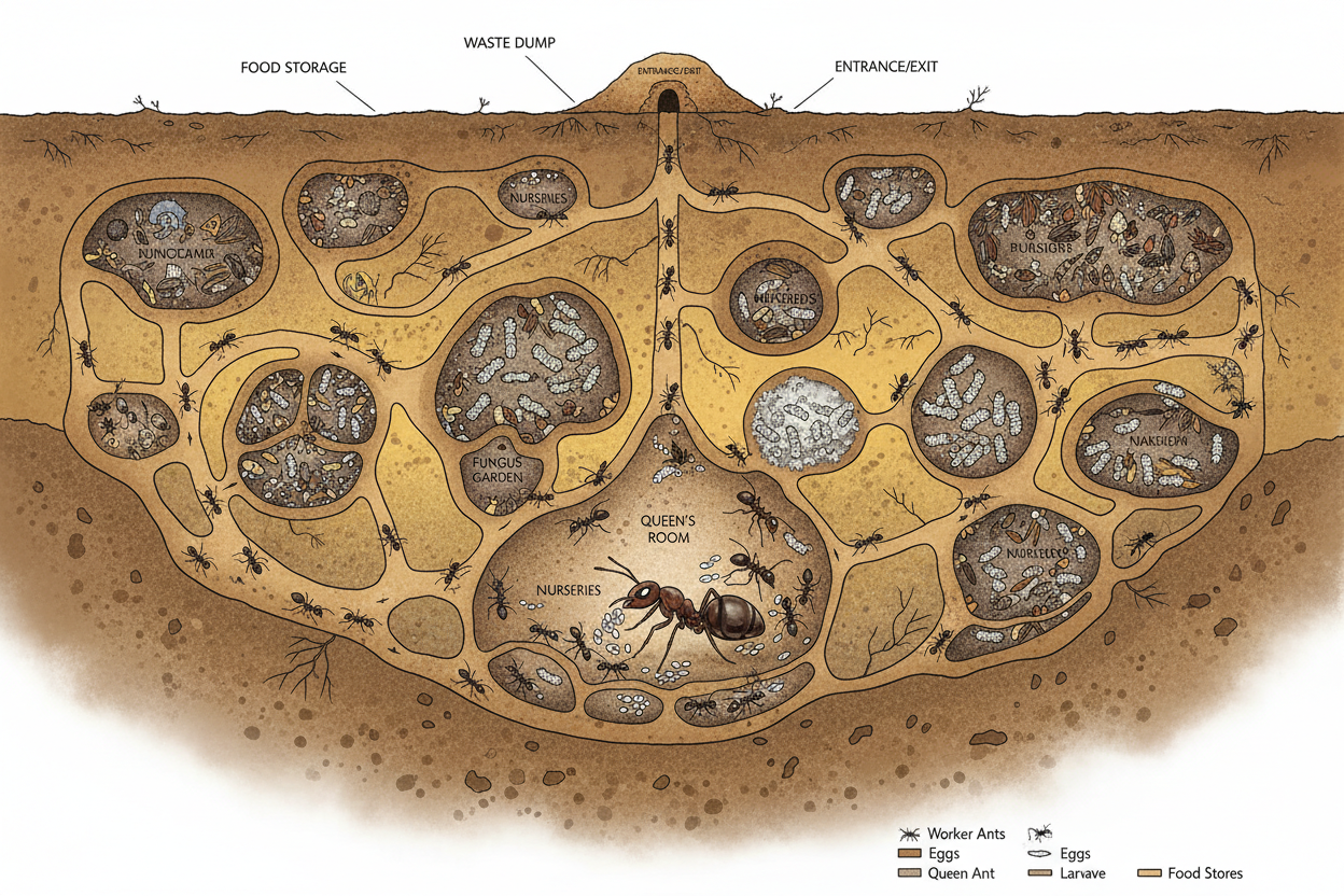 Bir karınca yuvası, rastgele açılmış tünellerden ibaret değildir. İçerisinde kraliçenin odası, yumurta ve larvaların bakıldığı kreşler, yiyeceklerin depolandığı kilerler gibi amaca göre düzenlenmiş birçok bölüm bulunur. Büyük kolonilerin yuvaları, yer altında yüzlerce metrekarelik alanlara yayılan devasa şehirler haline gelebilir. Bu da karıncaları, gezegenin ilk şehir planlamacıları yapar.