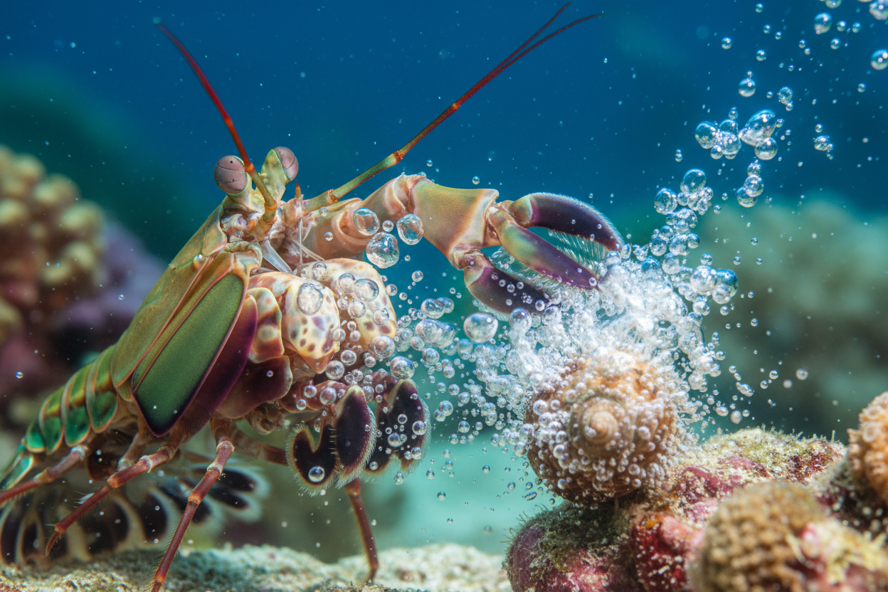 Mantis karidesinin yumruğunun sırrı sadece hız ve güçle sınırlı değildir. Vuruş o kadar hızlıdır ki, suyun içinde küçük buhar kabarcıkları oluşturur. Bu olguya kavitasyon denir. Bu kabarcıklar saniyenin binde biri gibi bir sürede patladığında, ikinci bir şok dalgası yaratır. Bu patlama sırasında ortaya çıkan enerji, anlık olarak yüzlerce derecelik bir sıcaklık ve güçlü bir ses dalgası oluşturur. Yani, mantis karidesi avını ıskalasa bile, kavitasyon kabarcıklarının patlamasıyla oluşan şok dalgası avını sersemletebilir veya öldürebilir. Bu, doğadaki en etkileyici avlanma mekanizmalarından biridir.