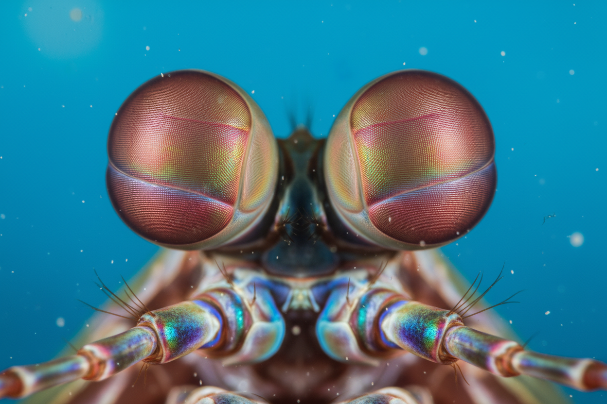 Mantis karidesinin bir diğer süper gücü ise gözleridir. Hayvanlar aleminin en karmaşık ve gelişmiş görme sistemine sahiptirler. İnsan gözünde kırmızı, yeşil ve mavi olmak üzere üç tür renk reseptörü (fotoreseptör) bulunurken, mantis karidesinin gözlerinde 12 ila 16 farklı fotoreseptör hücresi bulunur. Bu, onların bizim hayal bile edemeyeceğimiz renkleri ve renk tonlarını algılayabildikleri anlamına gelir. Ayrıca polarize ışığı da görebilirler, bu da su altında avlarını ve avcıları daha net bir şekilde ayırt etmelerine yardımcı olur.