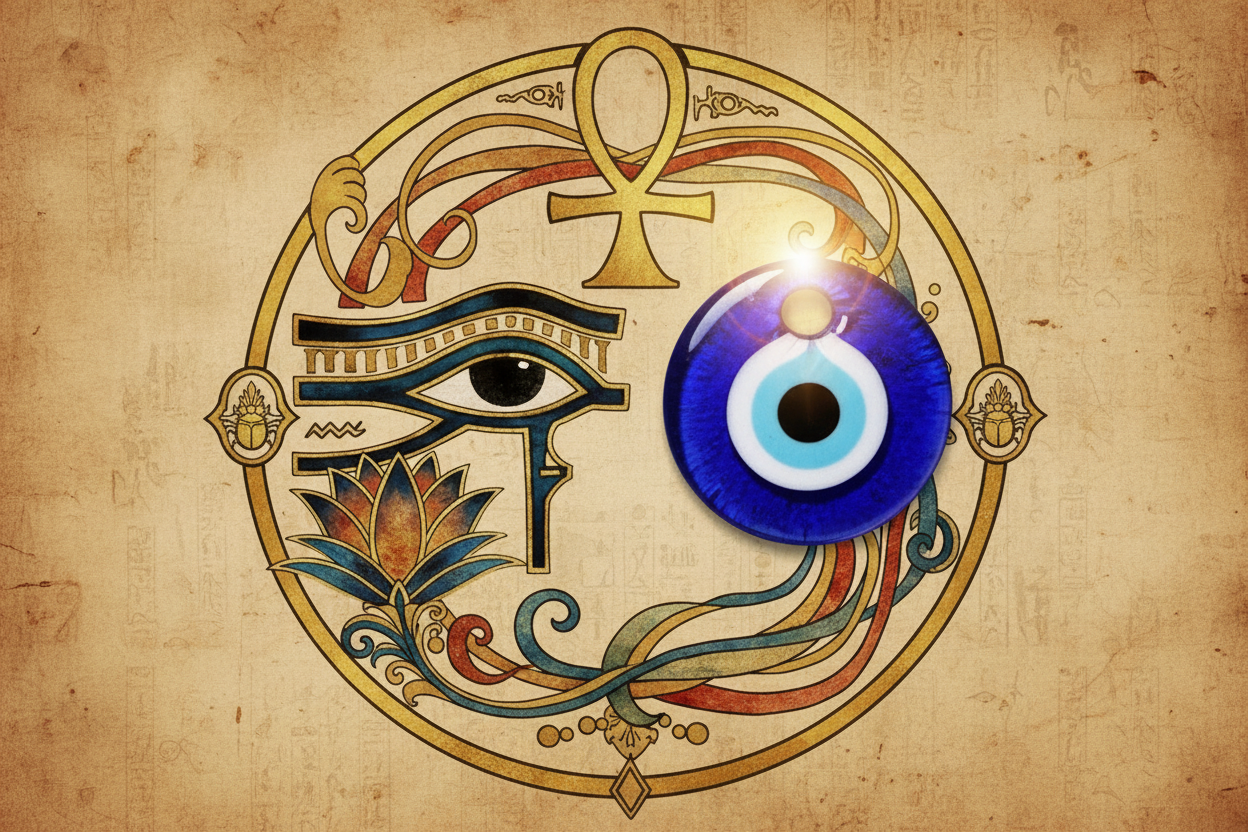 Göz figürünün koruyucu bir sembol olarak kullanılmasının en bilinen örneklerinden biri Antik Mısır’daki “Horus’un Gözü”dür. Gökyüzü tanrısı Horus’un, düşmanı Seth ile olan mücadelesinde kaybettiği ve sonra yeniden kazandığı gözü, zaferin, şifanın ve ilahi korumanın sembolü haline gelmiştir. Bu güçlü sembolün, nazar boncuğundaki göz figürünün en önemli ilham kaynaklarından biri olduğu düşünülmektedir. Kötülüğe karşı ilahi bir gücün korumasını temsil eder.