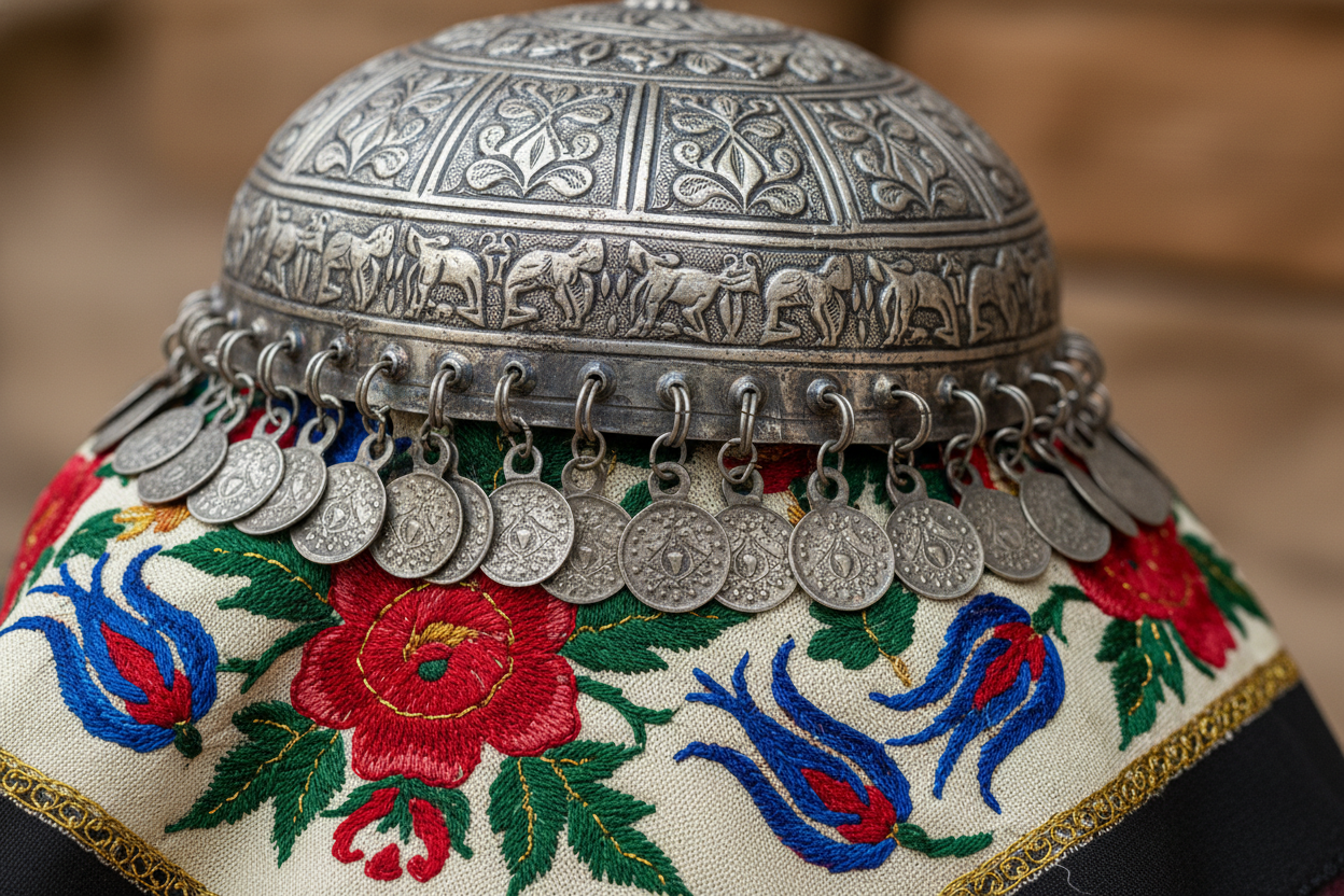 - Tepelik ve Takılar: Başörtüsünün üzerine takılan, gümüşten yapılmış ve altın liralarla süslenen tepelikler, kıyafeti tamamlayan en önemli aksesuarlardandır. Geleneksel bilezik, kolye ve küpeler de bu zenginliğe eşlik eder.