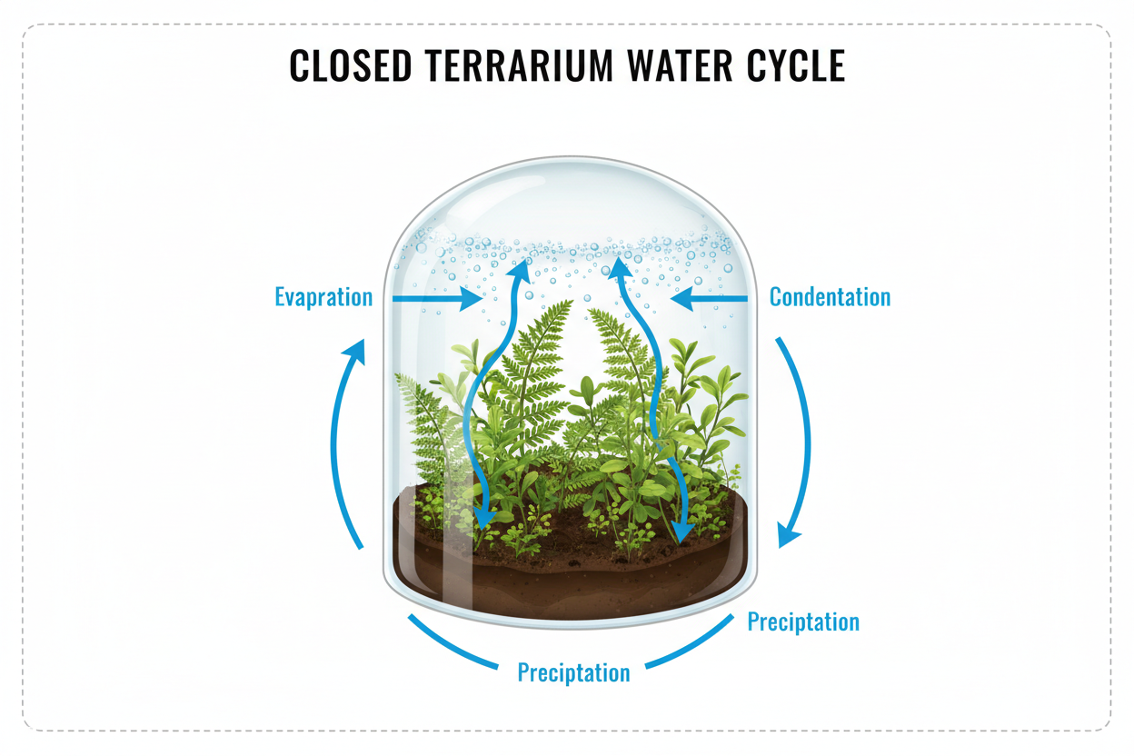 - Döngünün Tamamlanması: Toprağa dönen su, bitkilerin kökleri tarafından tekrar emilir ve döngü yeniden başlar. Bu sayede, kapalı bir teraryumun yıllarca sulanmaya ihtiyacı olmayabilir.