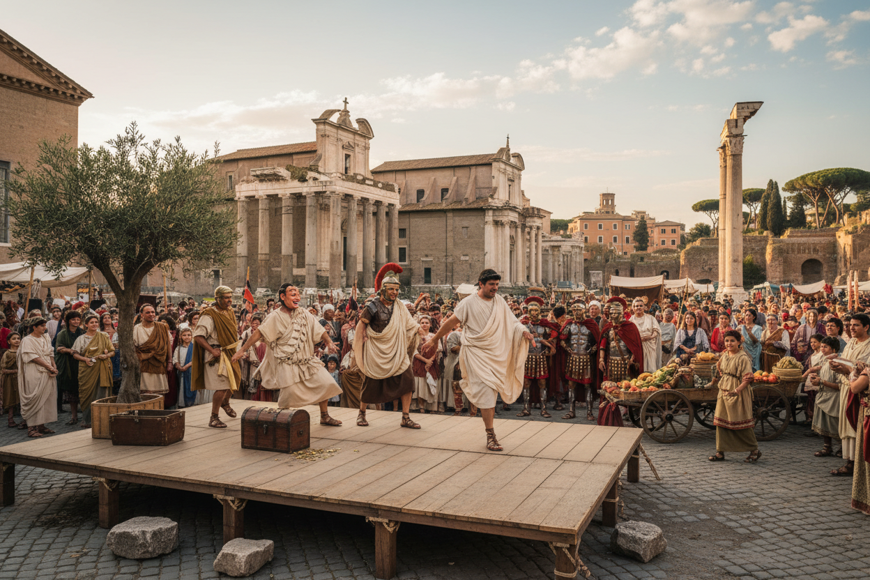 Yunan tiyatrosundan ilham alan Romalılar, tiyatroyu kendi kültürel yapılarına uyarladılar. M.Ö. 55 yıllarında Roma’daki Pompey Tiyatrosu, taş kullanılarak inşa edilen ilk kalıcı tiyatro binalarından biri oldu. Romalılar, Yunan trajedisinin aksine daha çok komedya ve halka yönelik gösterilere ağırlık verdiler. Gladyatör dövüşleri ve sirk gösterileri gibi daha popüler eğlenceler de tiyatronun yerini almaya başladı, ancak Roma tiyatrosu mimarisi ve sahneleme teknikleri açısından Avrupa’ya önemli bir miras bıraktı.