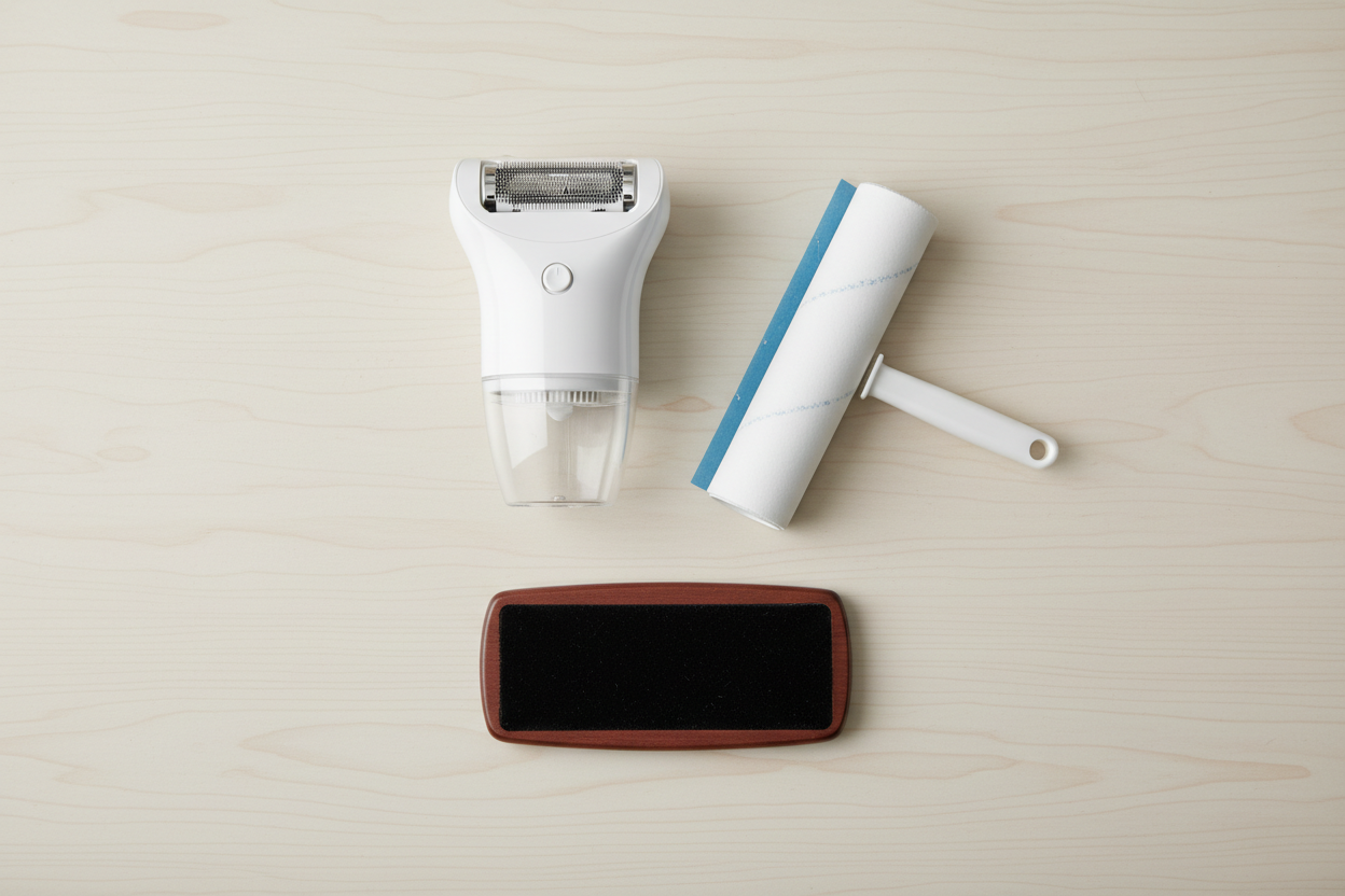Elektrikli tüy toplama makineleri (kumaş tıraş makinesi olarak da bilinir), yüzeydeki tüy ve topakları kumaşa zarar vermeden keserek temizleyen en etkili araçlardan biridir. Makineyi kullanırken giysiyi düz bir zemine yayın ve cihazı kumaş yüzeyine paralel tutarak nazikçe gezdirin. Özellikle kazak, eşofman ve döşemelik kumaşlarda harika sonuçlar verir.