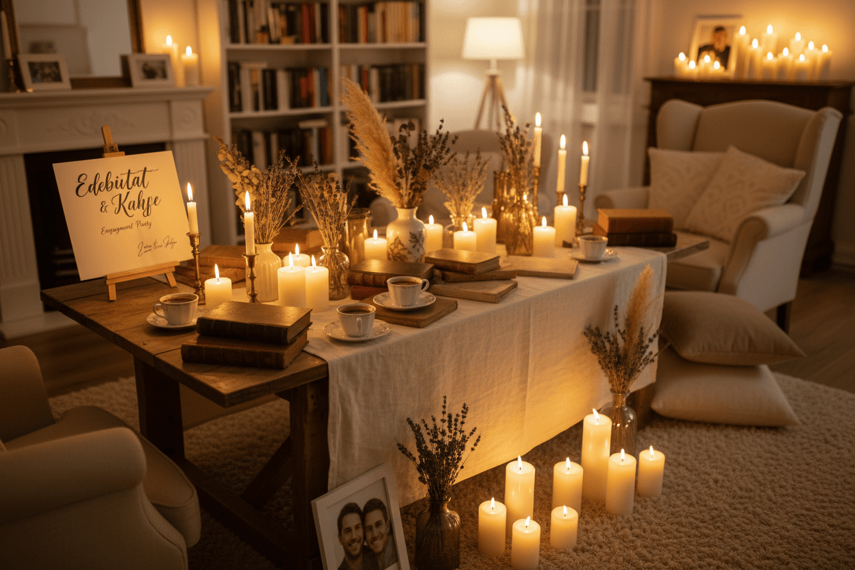 - Edebiyat & Kahve Teması: Kitapların arasında kaybolmayı ve taze kahve kokusunu seviyorsanız, bu tutkunuzu nişanınıza taşıyın. Eski kitaplar, kuru çiçekler ve mumlarla süslenmiş bir masa, misafirlerinize ikram edeceğiniz farklı kahve çeşitleri ve üzerinde sevdiğiniz şairlerden alıntılar bulunan küçük kartlarla sıcak ve entelektüel bir atmosfer yaratabilirsiniz.