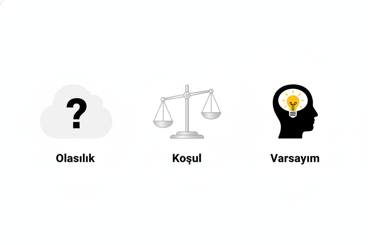 Kısacası, olasılık “belki olur” der, koşul “bu olursa şu olur” der. Varsayım ise “olduğunu kabul edelim ve şimdi ne olacağını düşünelim” der.